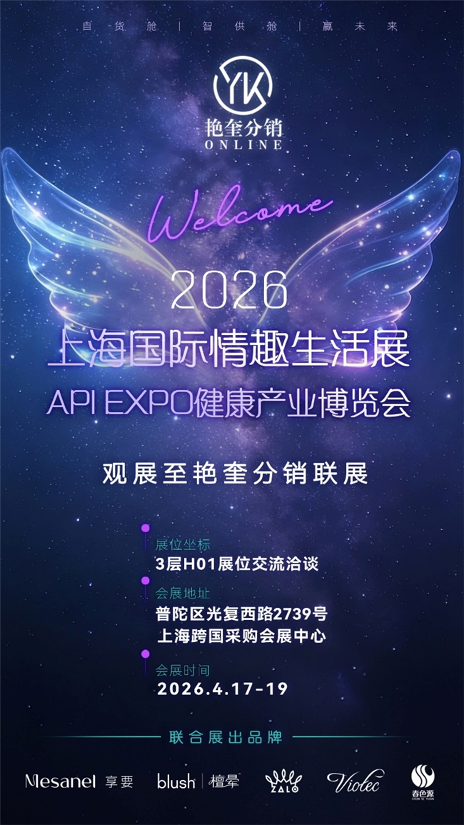 2026 年 4 月 17 日,以“未来之眼趣动全球”为主题的上海国际情趣生活及健康产业博览会(2026API上海成人展)于上海跨国采购会展中心盛大启幕。深耕行业二十余载的艳奎情趣分销以「智供链新生态悦未来」为核心主题,携享要、Blush檀晕、ZALO、Viotec 紫罗兰及春色源五大联展品牌一起亮相本次展会,以多元产品矩阵、前沿创新成果及全球化供应链实力,成为本届展会备受关注的焦点展区。